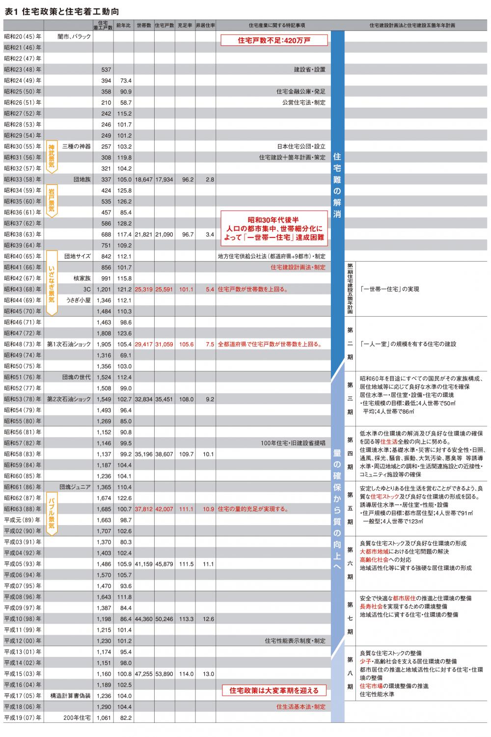 といった答申がさまざまな審議会で浮上するのもこの時期です。さらに、「住宅」を「人生の大半を過ごす欠くことのできない生活基盤」「都市や街並の重要な要素」「安全、環境、福祉、文化といった地域の生活環境に大きな影響を及ぼすという意味で社会的性格を有するもの」と記されるようになりました。これらを基に、「住生活基法」と「住生活十箇年基本計画」が平成18年に制定され(図2参照)、日本の住宅建設は、「住宅難の解消」「量の確保から質の向上へ」時代から「よいもの(住宅)をつくってきちんと手入れをして大切に長く使う」時代へ大きく変革しています。
