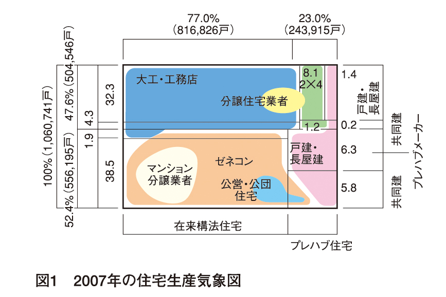 21世紀の住宅産業は、経済産業省によると、住宅投資が毎年約20兆円、産業規模が40兆円超であり、投資約20兆円は住宅着工100万戸超(国土交通省の建築着工統計)となります。建築生産などを専門とする東京大学教授・松村秀一氏は『「住宅ができる世界」のしくみ』(98年刊行)の「はじめに」で、「『住宅ができる現実の世界』のしくみすらわからずに、つくる対象としての住宅像など論じてみたところで無力だと考えるからこその歯がゆさである。なんとかして、「住宅ができる世界」のしくみを整理して説明したい。そしてそのうえで、住宅メーカーの過去も、工務店の現在も、建築家の将来も、みんな一緒に考え、論じてみたい」と説き、住宅建設の全体像を「住宅生産気象図(日本建築センターが最初に作成する)」(図1を参照)に描いています。同書は、戸建住宅を中心に、建築家と「住宅ができる現実の世界」とを分け隔てて論じています。また、建築家・隈研吾氏の『10宅論・10種類の日本人が住む10種類の住宅』(86年刊行)も、松村氏のいう、建築家の「つくる」住宅だけでなく「できる」も含めすべて(大半)の住宅を対象としています。