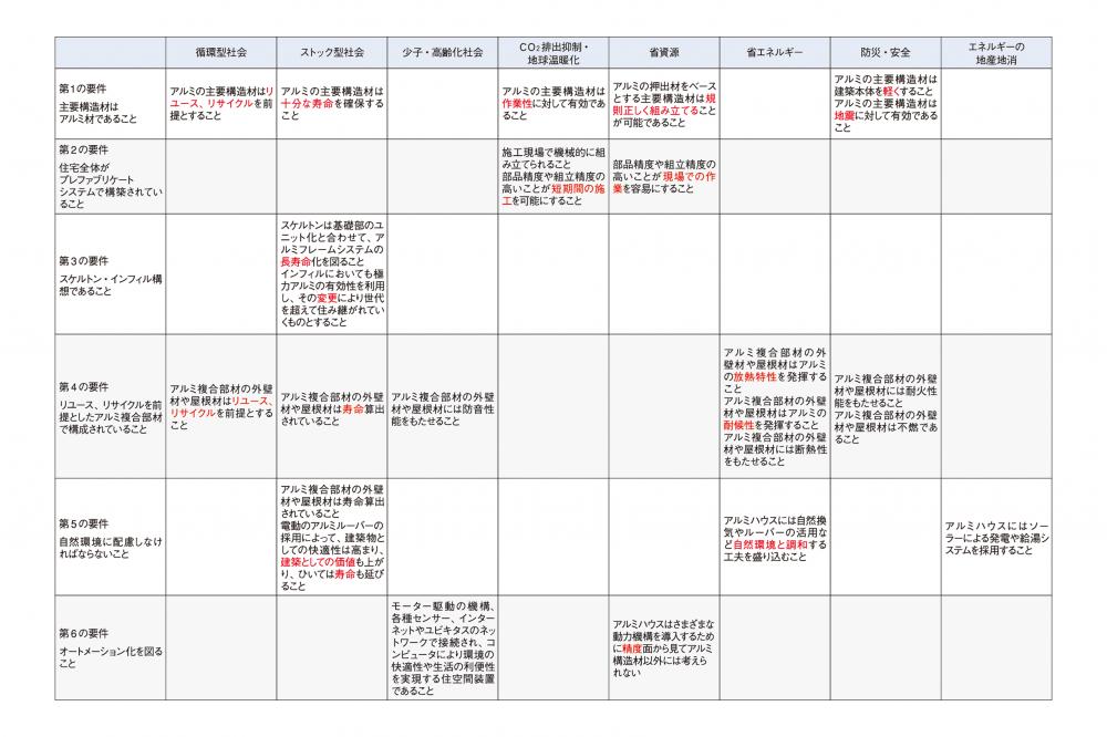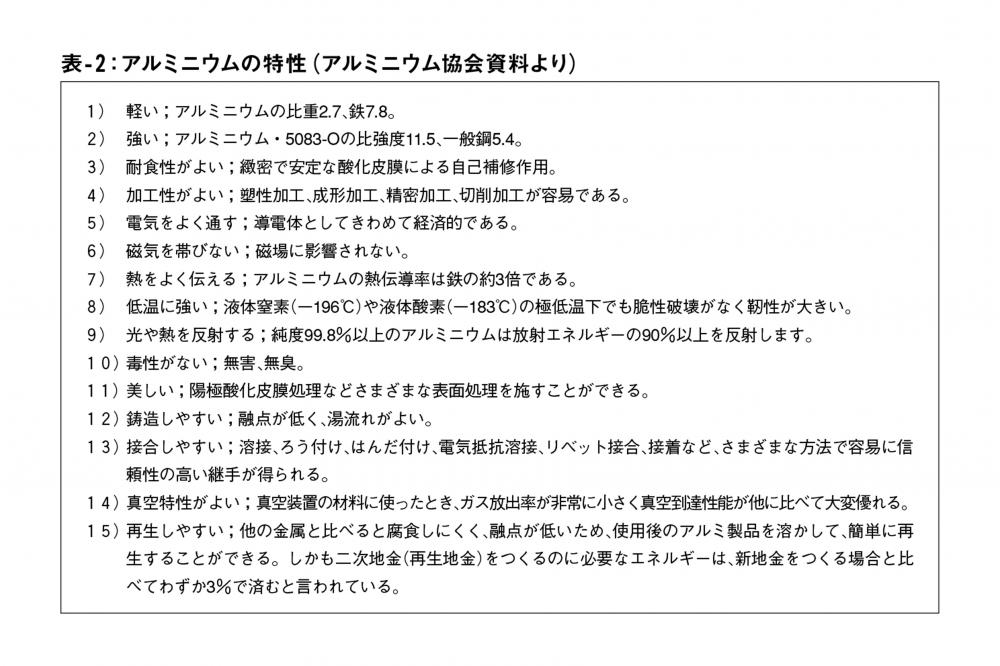 これらが前項で述べた現在における時代、社会からの要請にどのように応えているかは、表︲3となります。ここにはアルミであるがゆえの解答があり、アルミの持つ特性(表-2を参照)が活かされるだけではなく、アルミの加工技術も活かされています。