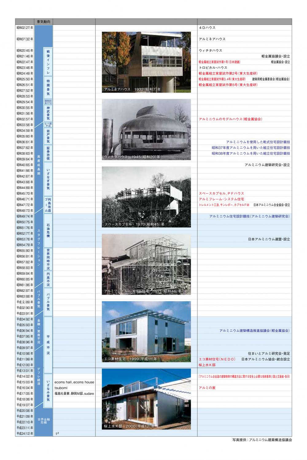 1期は、戦後間もなく星野昌一氏などの指導の下、フラーの「ダイマキシオン・ハウス」と同様に量産を目的として「軽金属組立家屋」などが試作されました。次に65年以降、海外からアルミハウスの技術を導入したアルミ企業5グループが、工業製品で組み立てられた「アルミネアハウス」のごとく、自社製作したアルミ部材でアルミハウスの供給を始めます。日軽アルミグループの「スペースカプセル」は3000棟、古河アルミニウム工業の「フレーム・システム住宅」は数十棟に及びました。しかし、74年の第1次オイルショック、高度成長の終焉によって、アルミ産業は国内精練の撤退という大きな構造改革を余儀なくされ、アルミハウスの開発も中断されました。