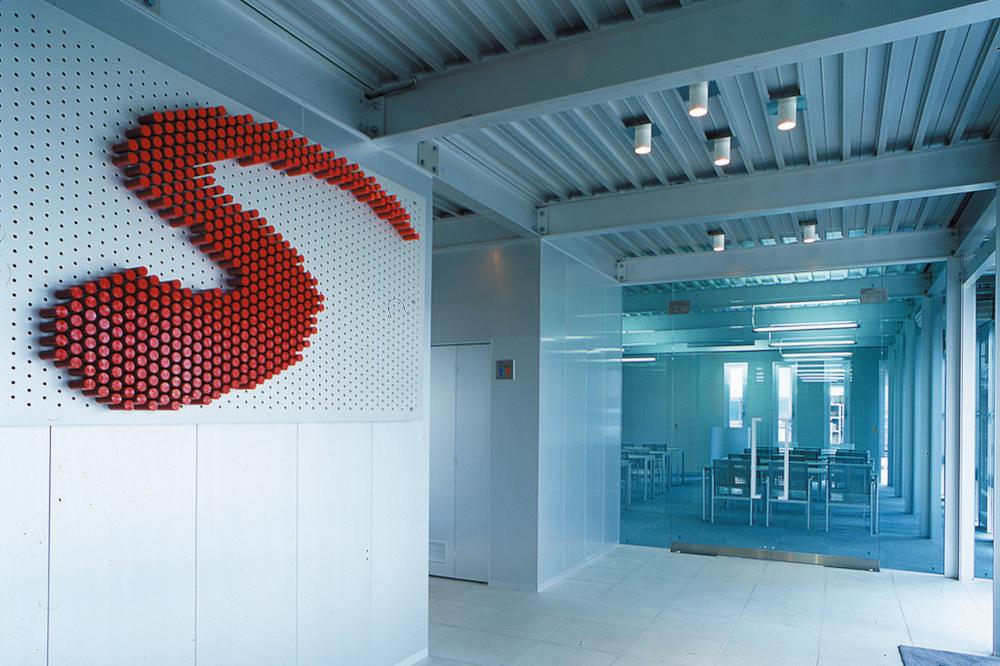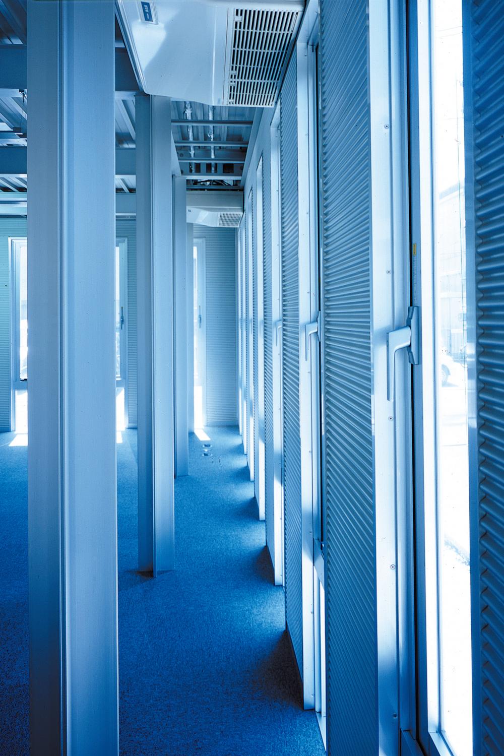 ecoms hallでは設計・意匠の基本的な考え方を「見せるアルミ造」としているため、トイレを除く各室には天井を設けず柱梁部材及び屋根デッキプレートなどのアルミニウム部材のアルマイト表面をそのまま露出しています。また外壁面は縦目地の平滑プレートと縦長の開閉窓の組合せとし、アルミニウムの質感にマッチしたスレンダーなファサードとしました。床材は玄関ホールをアルミプレート(表面ブラスト)、社員食堂は明色系パイン材の木質フローリング、会議室をダークグレー色調のフロアカーペットとし、各室の用途目的に合わせた素材フローリングとしました。