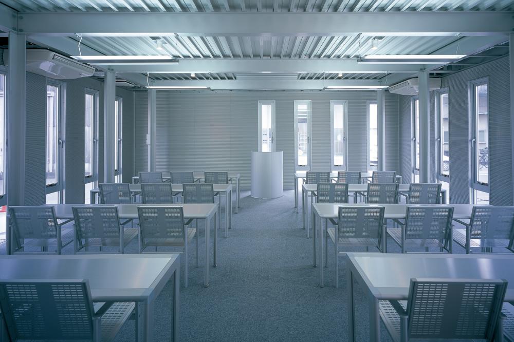 溶融温度の低さによる防・耐火性不足、遮音性及び高コストに関しては、今後重点的に取組まれるべき課題であると言えます。しかしながら上記①~⑥のメリットとのトレードオフとしてアルミニウム造建築を総合的に評価すれば、既住の建築像を進化・発展させるに十分足る潜在力を有すると考えられます。ecoms hallは、アルミニウム構造材料が一般認定を取得してからの確認申請物件第1号として、SUSが自社敷地内に社員厚生施設として建設しました。アルミニウム造平屋で延床面積214.94、主用途は社員食堂と会議室です。工期は2003年1月20日~5月8日と短工期でした。