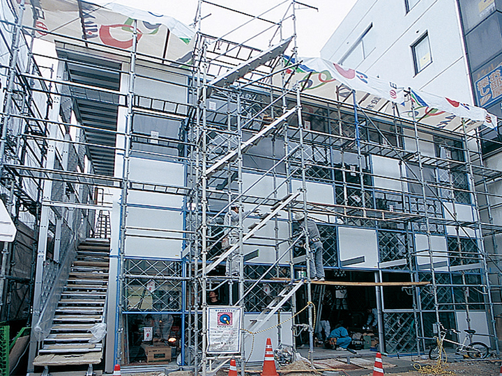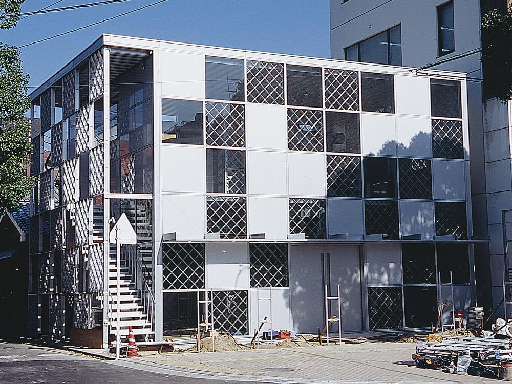 垂直・水平方向ともに構造が固まると、スキンとしての外壁の取付けを行う。外壁面としてはアルミ断熱パネル、突出し窓、網入ガラスの3種類が用意され、設計者の意図や設計条件に応じて自由な位置に取付けを行うことができる。ラチス構造から独立した内壁を組み立てることで、各プログラムに応じた空間を内部に計画することができる。