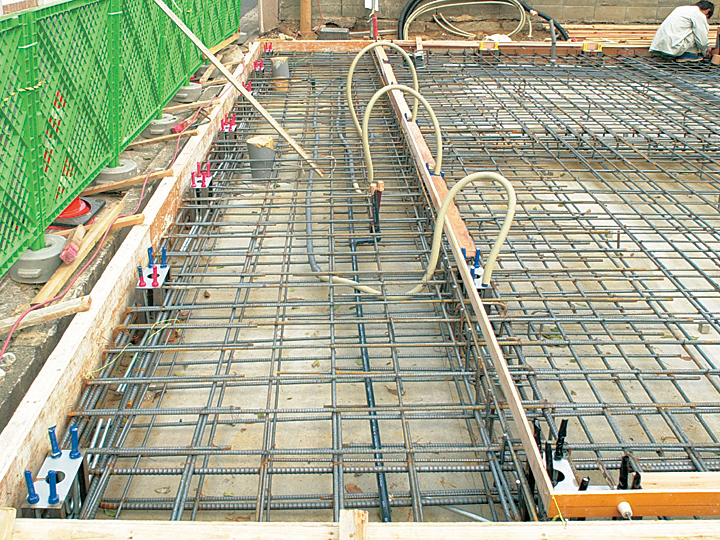 基礎は施工性を考え、マットスラブとして設計。捨てコンクリートには差し筋を行い、アンカープレートは溶接にて所定の位置に固定。アルミの工場加工精度と現場作業の誤差を最小にするため、アンカーの位置出しには細心の注意が必要。またアルミの腐食を避けるため、コンクリートに接する面にはジンクロメート錆止めペイントを塗布。