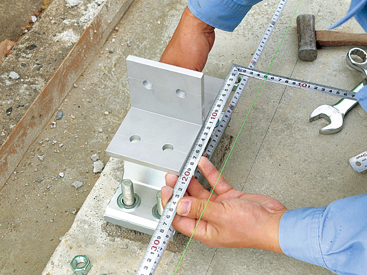 基礎は現場作業なので、どうしても誤差が粗くなる。しかし上に乗るアルミの躯体は誤差1~2mmという精度ですから、その2つをジョイントするアンカーボルトの位置が2mmでもずれていると穴が合わない。非常に気を使う作業でした。
