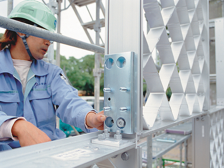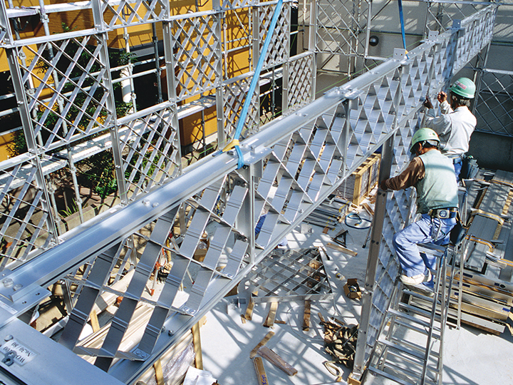 柱脚形材施工後、ラチスパネルを1~4段まで組立。1段ずつラチスパネルの仮締めを行い、施工が進むにつれ誤差が大きくならないように必ず各段ごとに水平・垂直方向のレベルの調整を行う。2段目以降はあらかじめラチスパネルに縦枠・コーナー枠、上部の十字接合材を取り付けておき、セット後の取付作業を最小限にとどめる。