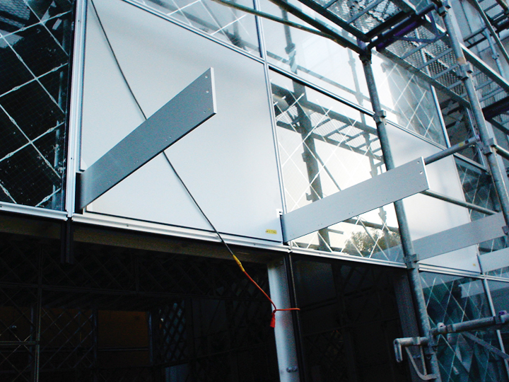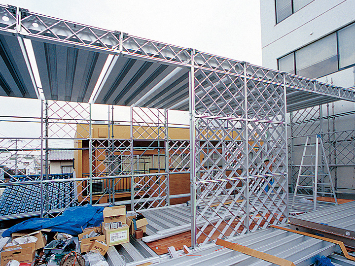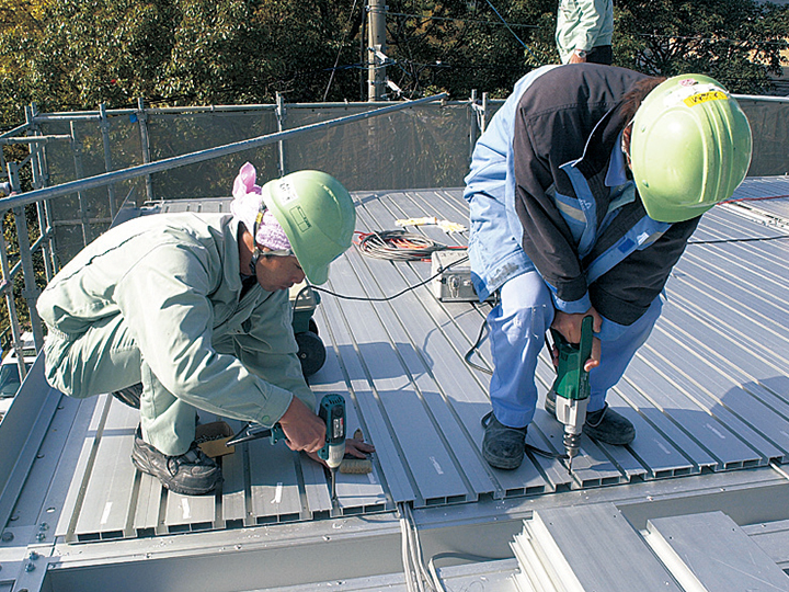 4段目下端の高力ボルトまで本締めを行い、その後地組みした梁ユニットの取付けをおこなう。床版ユニットは所定の位置に並べ、ユニット同士は接合材を用いてビス止めにする。折版に直行する側の端は中ボルトで固定し、その際ブラインド用のブラケット、2階アルミアングル巾木を共締めにする。屋根面も同様に施工する。