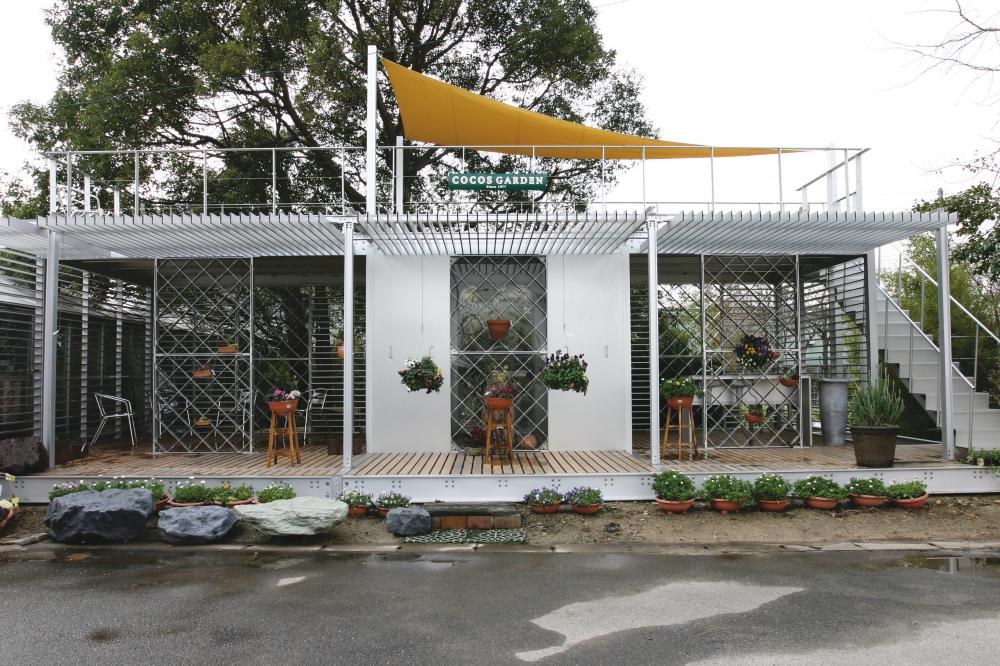 海の家は『ecoms DIY system』としてセルフビルドと仮設性を考慮して作られたものであったため、建築施工や解体がスムーズに行えるように全てボルト接合で組み立てられていました。そのため、完成時とはほぼ同じ状態でリユースされ、今度はフラワーショップになりました。
