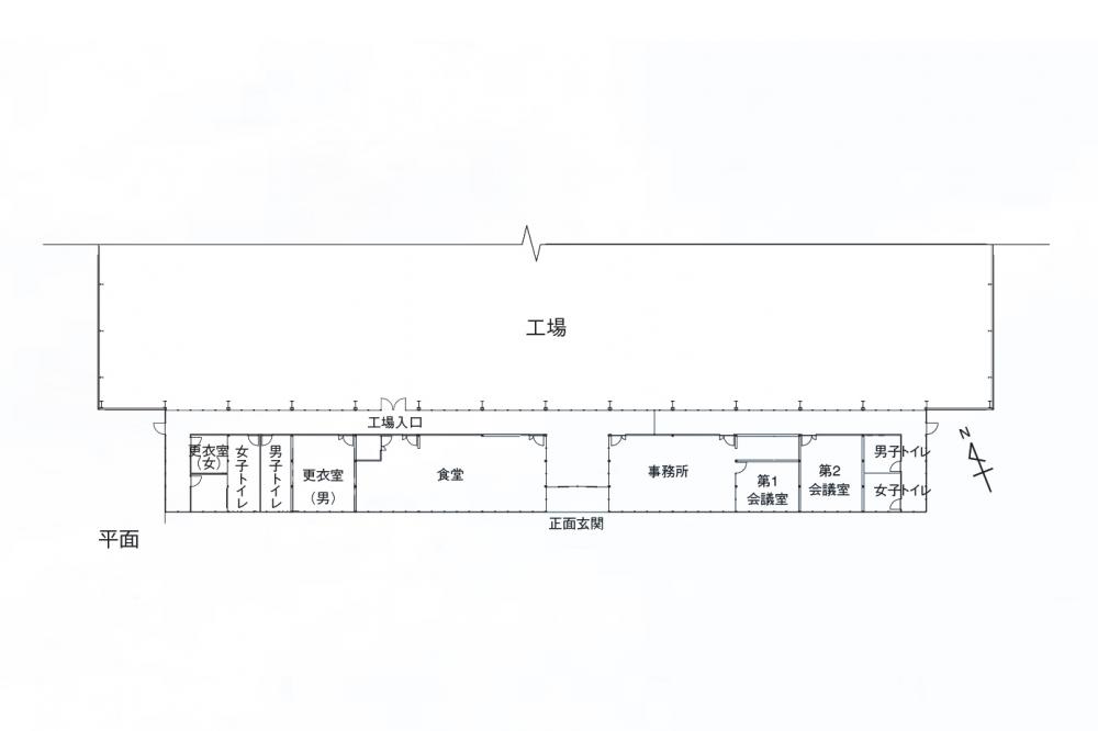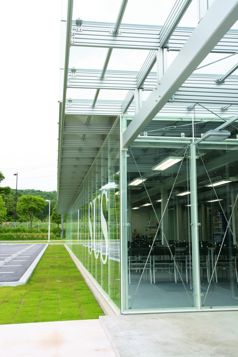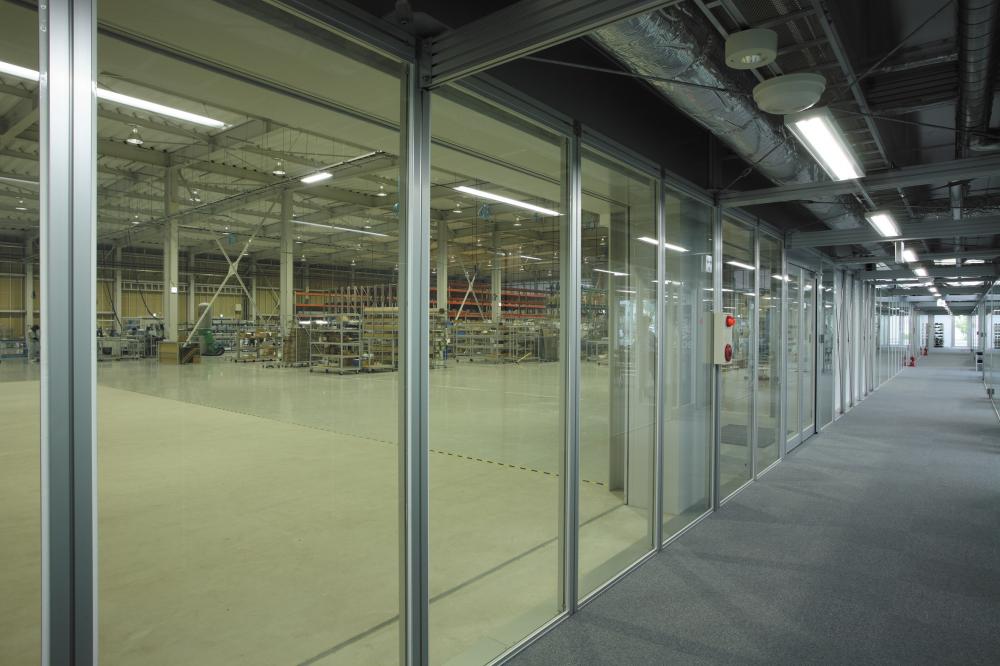 この工場の大きな特徴は、工場棟と事務棟を機能的にも構造的にわけていることです。大きな空間が必要である工場棟にはスパンをとばすことのできる鉄骨造を、中小の空間を複数必要とする事務棟にはアルミ合金造を採用しました。これにより事務棟はガラス張りで開放感のある空間となり、工場棟との対比も明確になりました。