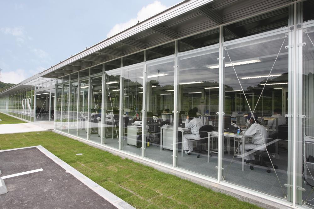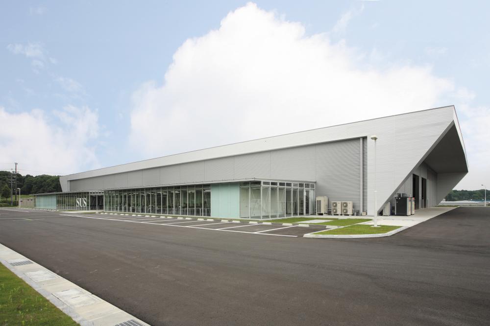 工場棟のデザインは、昨年2007年12月、タイ・ランプーンに竣工したSUSタイランド新工場のイメージを踏襲しています。つまり側壁を妻面で斜めにカットし、浮遊感、躍動感を表現しています。外壁については、アルミとガルバリウム(アルミニウムと亜鉛の合金)を貼り分けることでSUSらしさを表現しました。