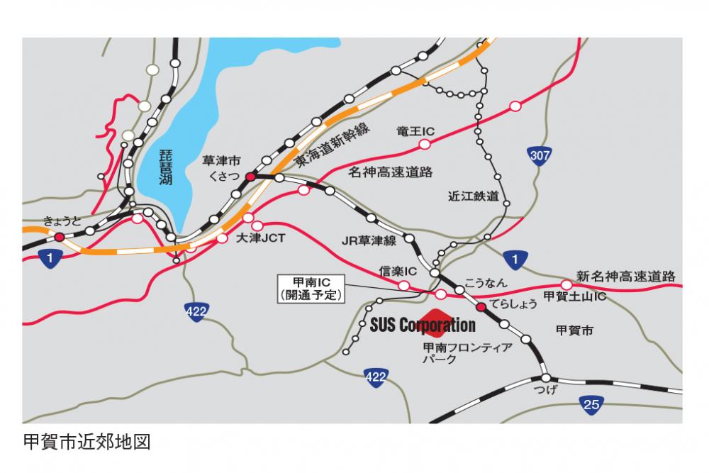 SUS滋賀事業所は、FA(ファクトリーオートメーション)向けのアルミ製フレームおよびアルミパネル、樹脂パネルの切断や加工、各種アクセサリーパーツのピッキング、製品組立などの工程を担う工場で、主に東海・関西・北陸地区に向け製品を供給していきます。2009年春には新名神高速道路甲南インターチェンジも開通する予定で、デリバリーの拠点としても期待が高まります。