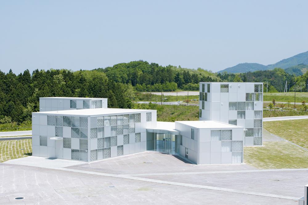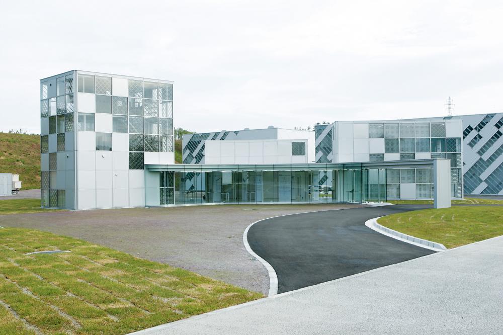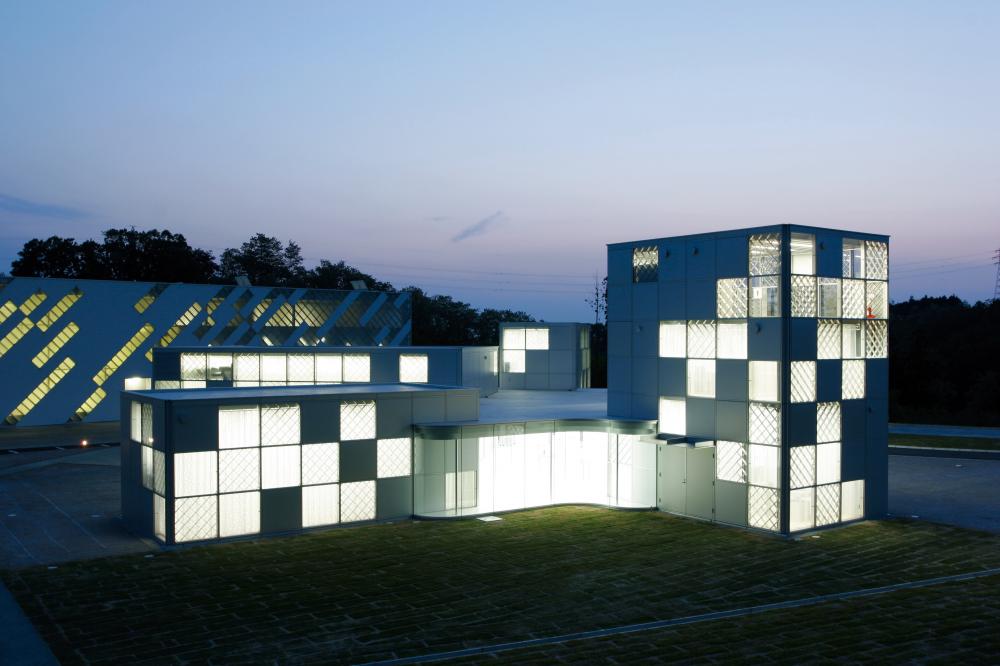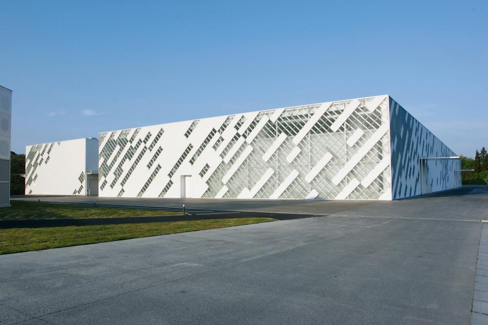 隣接して押出・加工の工場棟と表面処理を施すアルマイト棟も建設され、純白のスレートとガラスブロックのパターンが施された外観は、通常見慣れた生産工場の様相とはかけ離れた鮮やかさを呈しています。