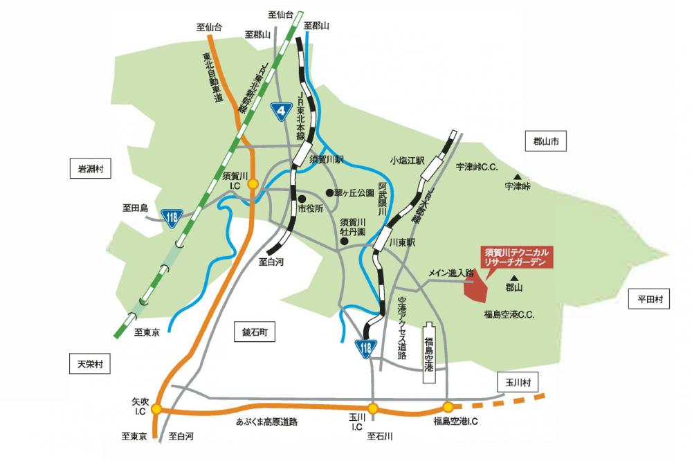 立地場所の虹の台は、東北自動車道須賀川ICから12km、福島空港から7kmとアクセスも便利。周囲を自然林が取り囲む緑豊かなこの場所に、SUS最大の生産拠点が誕生しました。