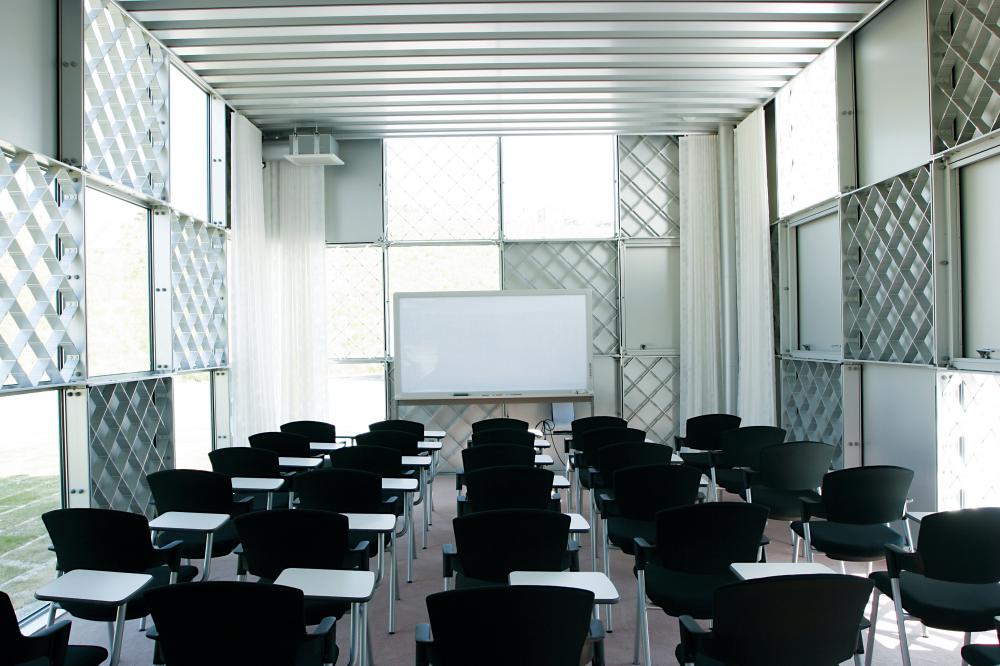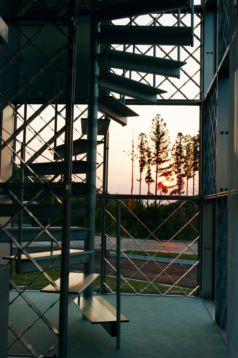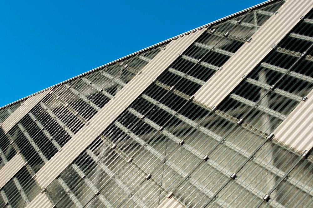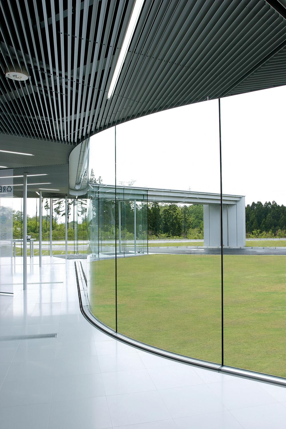 夕空をラチス越しに望めば、差し込む光が格子模様を描き出し神秘的な美しさすら感じられます。パネル表面はアルマイトつや消しクリア塗装で仕上げられ、自然光が溶け込むスケルトン・ファサードは青々とした芝が広がる屋外と不思議な一体感を生み出しています。