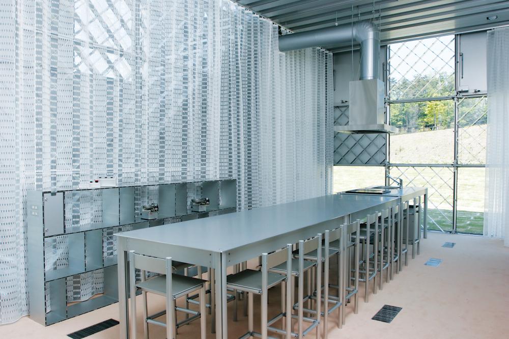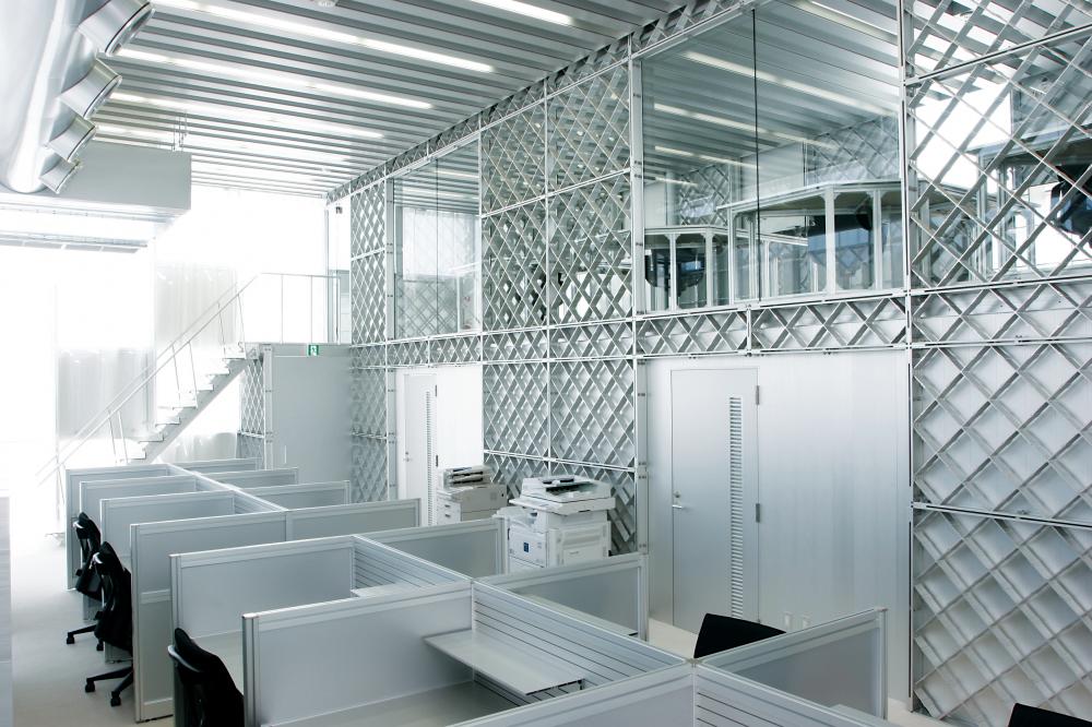 事務棟は、SUSと山本理顕設計工場との共同開発による「ラチスパネル」を用いたオールアルミ建築。不規則に繋げられた建物は、1部3階建の独創的な設計で、従来のecoms houseとは一味違う意匠性の高さがうかがえます。