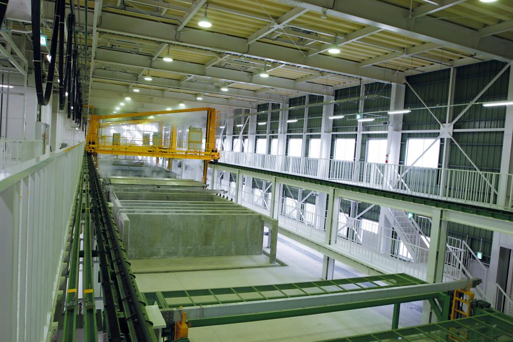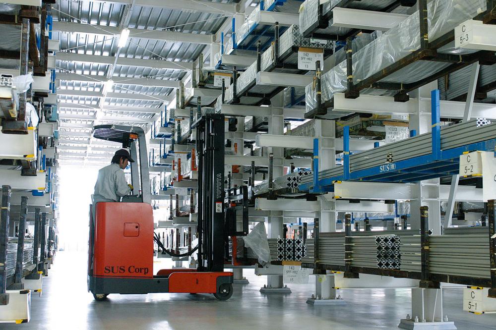 「アルミフレームの押出し加工」(ビレット買付~押出し~熱処理~アルマイト加工~切断~製品)を一貫して行えるのが、SUS福島工場です。昨年2004年11月の工場完成時にプレス能力2300tのアルミ押出し機を導入し、隣接地にアルマイト工場も建設。事務棟・工場棟・アルマイト棟を併せ持つ、SUS最大の生産拠点です。