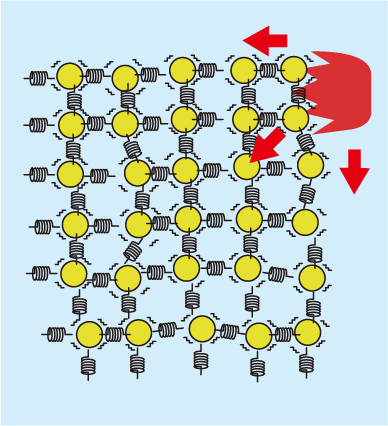 固体とは、原子が金属結合(原子同士が互いの電子を共有することで生じる化学結合)で力強く結びついた状態のことです。ビー玉のような原子がそれぞれを互いにバネでつなぎあっている状態をイメージしてください。この状態における原子(ビー玉)の振動が熱に相当します。振動が大きいときは熱量が多い(温度が高い)と考えてください。原子が振動している状態が「熱」で、その振動が大きいと高温、小さいと低温になります。このように「熱」はエネルギーのひとつなのです。それでは、金属のような固体の内部では、どのように熱が伝わっているのでしょうか。