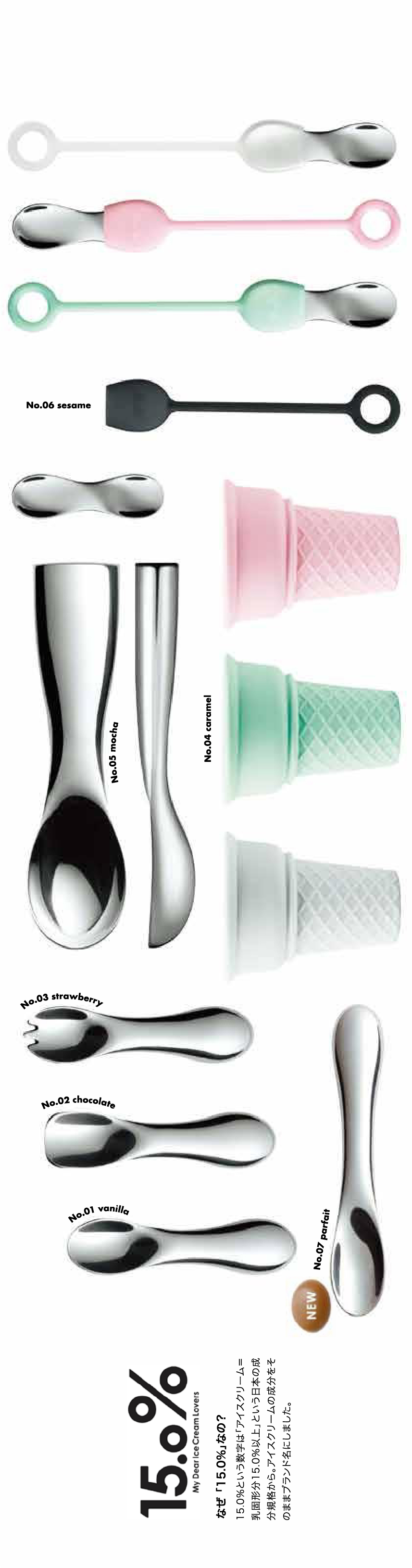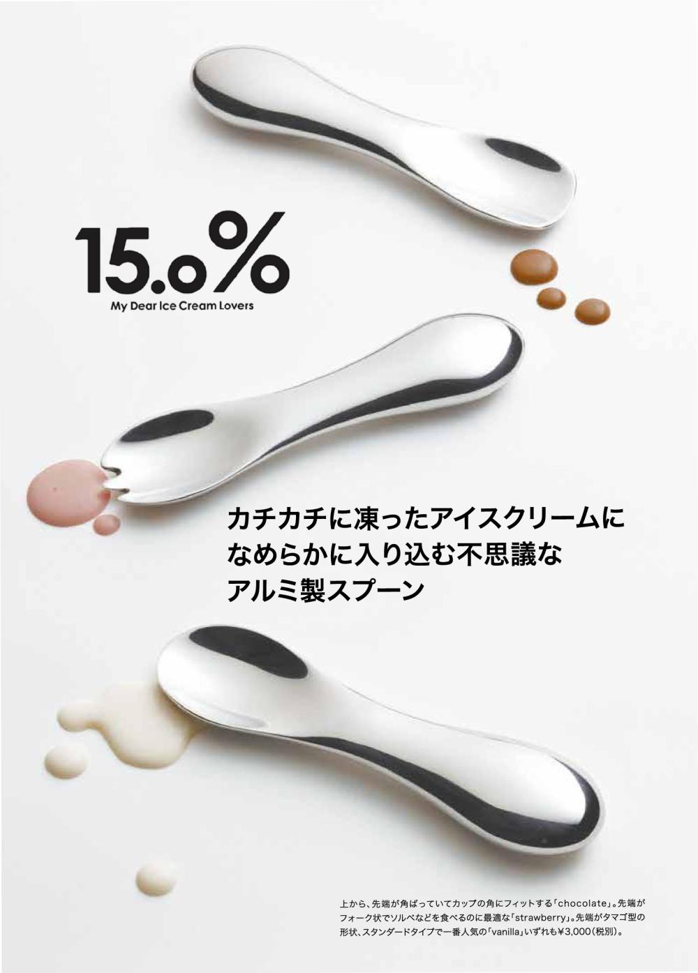 「寺田さんから、“スプーンだけで終わってしまっては製品が認知されない。アイスクリームを楽しむライフスタイルを提案するプロジェクトとしてブランド化してはどうか?”と、“15.0%”というブランド名も提案いただき、関連製品も展開していくことを決めました。“15.0%”というネーミングもインパクトがありますよね。“何ですか、この名前?”と聞いてもらえることで、製品とアイスクリームがより深く結びつくという寺田さんの発想には本当に頭が下がりました」。