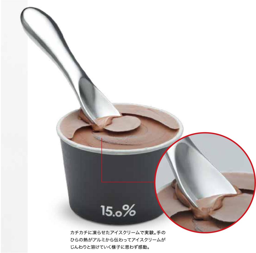 冷凍庫から出したばかりのアイスクリーム。カチカチでなかなかスプーンが入らない。「あぁ、今すぐ食べたいのに」とじれったい思いでしばらく待っていると周りから溶け始めてしまった・・・といった経験、ありませんか。そんな方にお薦めしたいユニークなアルミプロダクトがこちら。熱伝導率の高さを生かしたシンプルな仕組みに思わず納得。親しみやすいデザインに、自然と笑みがこぼれます。