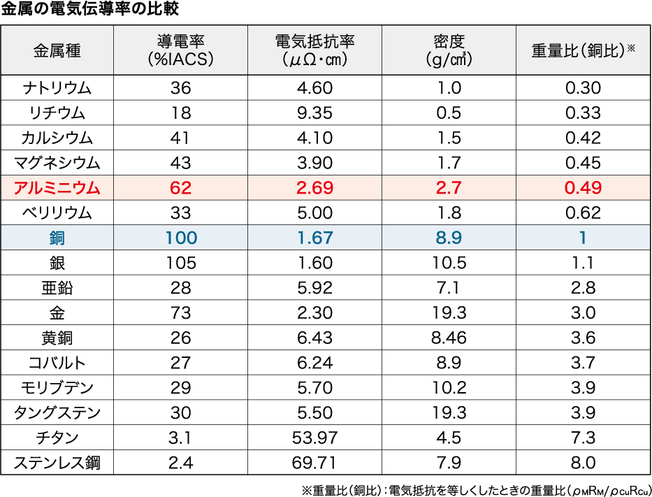 アルミは銀、銅、金に次いで「電気をよく通す」金属です。電気伝導率は銅の60%ですが、比重が3分の1であるため、同じ重さの銅に比べて2倍の電流を流すことができます。この特徴を生かし、高電圧の送電線など、さまざまな分野で銅からアルミへの置き換えが進んでいます。今回のアルミ素材学では、同じく銅からの置き換えが進んでいる車載用ワイヤーハーネスについてお話を伺いに住友電装株式会社四日市製作所を訪ねました。
