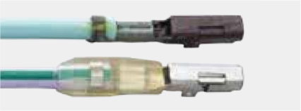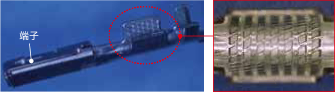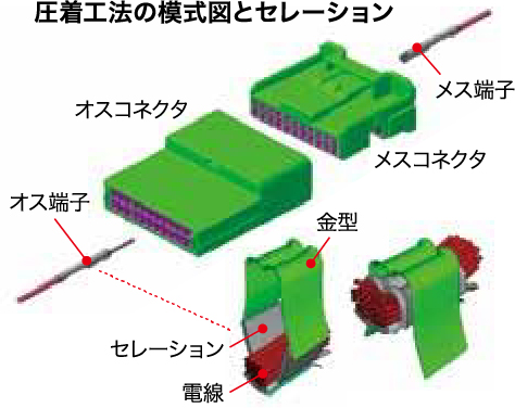 自動車に使われるワイヤーハーネスの本数は多い車種で約2,000本にも及びます。これらワイヤーハーネス同士を接続するのが、コネクタであり端子です。電線と端子とは圧着と呼ばれる、物理的圧力でかしめる工法で接続されますが、ここでもアルミならではの問題が発生しました。導体素線のアルミ表面に形成される強固な絶縁性の酸化膜が、電気伝導を阻害してしまうのです。そこで必要になるのが、酸化膜を破って導通を取る仕組みです。そこで工夫したのが端子の電線接続部分です。セレーションと呼ばれる細かい溝を彫ることで、圧着した際にアルミ表面の酸化膜が破れるようにしたのです。このことはコストダウンにも役立ちました。端子の電線接続部分のみの変更で、銅製ハーネス用のコネクタを流用することができました。なお、セレーションと接触しないアルミ素線が生じるような場合、つまりアルミ素線本数の多い、太いアルミ電線の端末接続部分には、超音波溶接を採用しています。超音波で振動することでアルミ素線同士が擦れ、酸化膜が破けます。