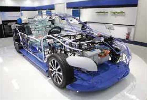 ワイヤーハーネスの色分けは国際規格で決まっています。オレンジ色のハーネスは高電圧回路です。触ると感電して危険であるということを示しています。電気自動車やハイブリッド車に用いるパワーケーブルなどがそれにあたります。バッテリーとインバータ、インバータとモータージェネレータを結ぶ高圧ケーブルです。従来は、高圧ケーブルから放射される電波ノイズが周辺の機器やケーブルに影響を及ぼすということで、1本ずつシールド遮蔽していました。これを簡易的にするために高圧ケーブル自体は遮蔽なしにして、パイプで囲うことで遮蔽効果を出すようにしています。ここにもアルミ電線が使われています。また一方、低電圧回路用のアルミの電線は絶縁被覆をラベンダー色でそろえています。リサイクルの際に銅とアルミが混じらないようにするためです。