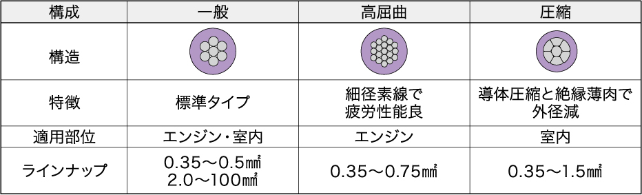 電線は、細い金属線(素線)が束になって、それを撚り合わせることでできています。どうして細い金属線を束にしないといけないかというと、曲げられるよう柔らかくするためです。そういったフレキシビリティを持たせないと配線が難しくなってしまいます。もう1つの理由は、振動に対する耐久性を持たせるためです。単芯はそれがないので、撚線が使われるのです。ハーネスには太いものも細いものありますが、使っている金属線の太さは大して変わらず、その数を変えることで太さも違ってきます。本数については構造上、もっとも安定する六角形の形状になるようにします。