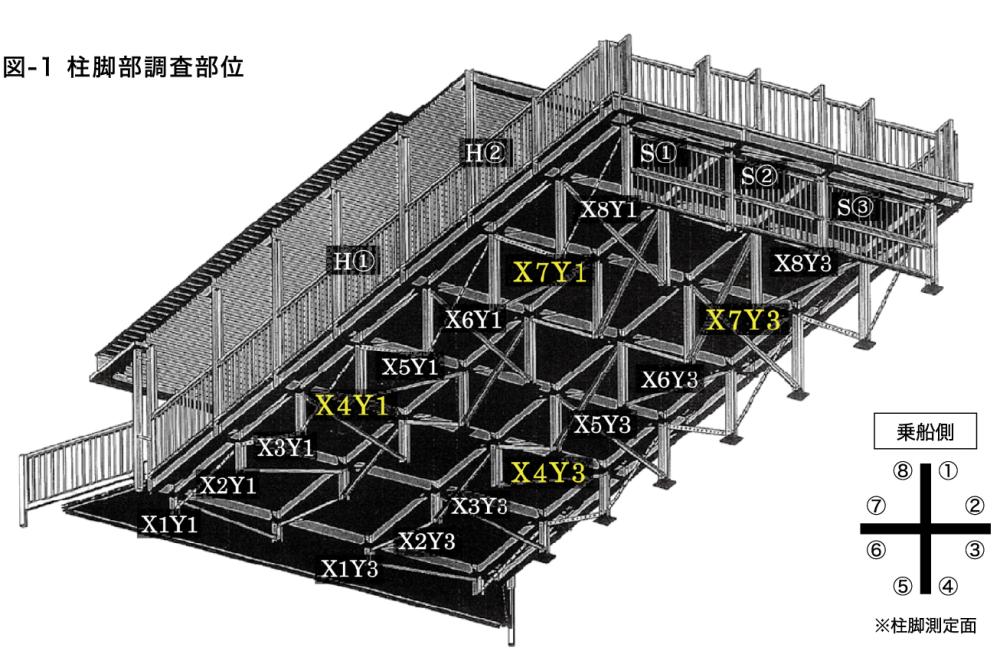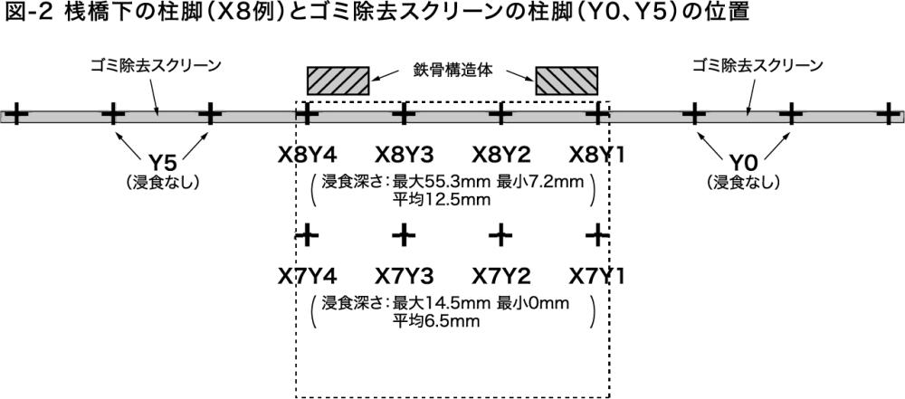 柱脚X8列で、Y1~Y4以外のアルミ構造体には、異常な孔食は見られていない。船着場側桟橋の柱脚X8列と同列のゴミ除去スクリーン(P.34参照)での柱脚Y0、Y5の各2本の柱脚下部では、アルミの浸食は皆無であった。このことから、柱脚Y0、Y5のアルミ柱脚は大型鉄骨構造体からの電気化学的接触腐食電流作用の影響は受けていないと判断できた。柱脚Y0、Y5の位置関係を図-2に示す。