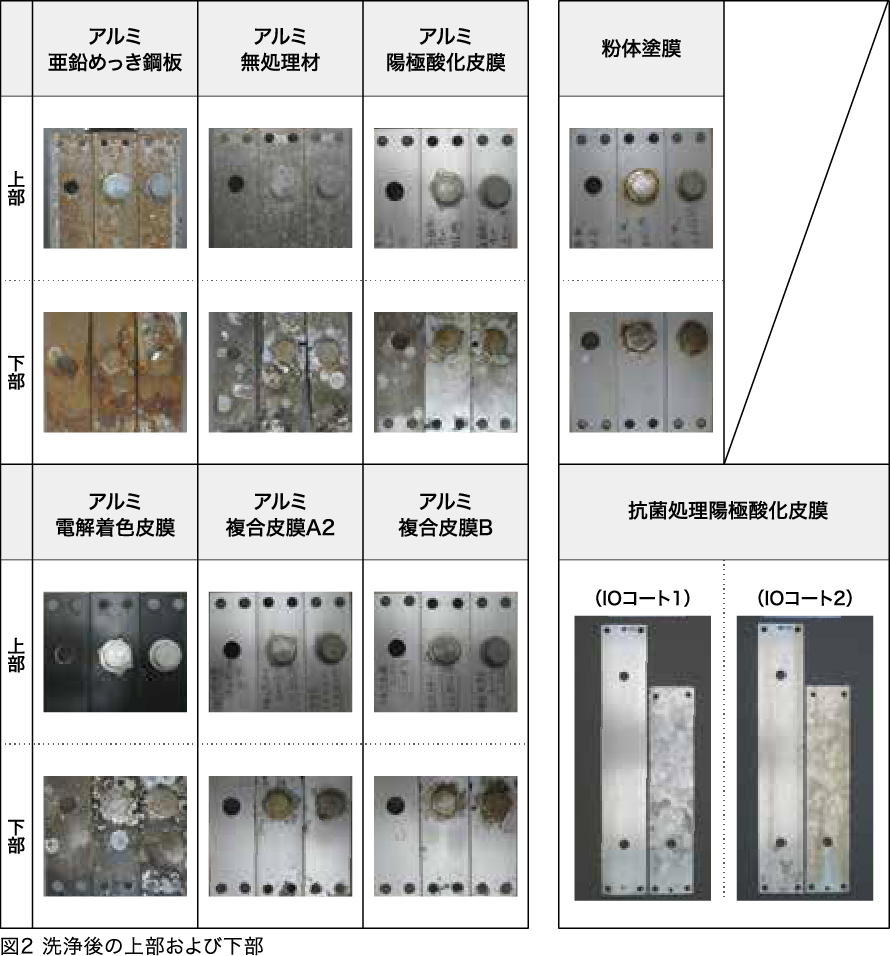 4年間の海域曝露で、アルマイト皮膜は、海水に浸せきされる度合いによって皮膜厚の減耗に大きな差異が生じた。試験体の上部は皮膜厚さの減耗がほとんどないが、試験体の下部は皮膜厚さ0.7μm ~2.3μmと少なく、ほとんど海水によって皮膜が溶出しており、4μm~8μmもの減耗を生じていた。