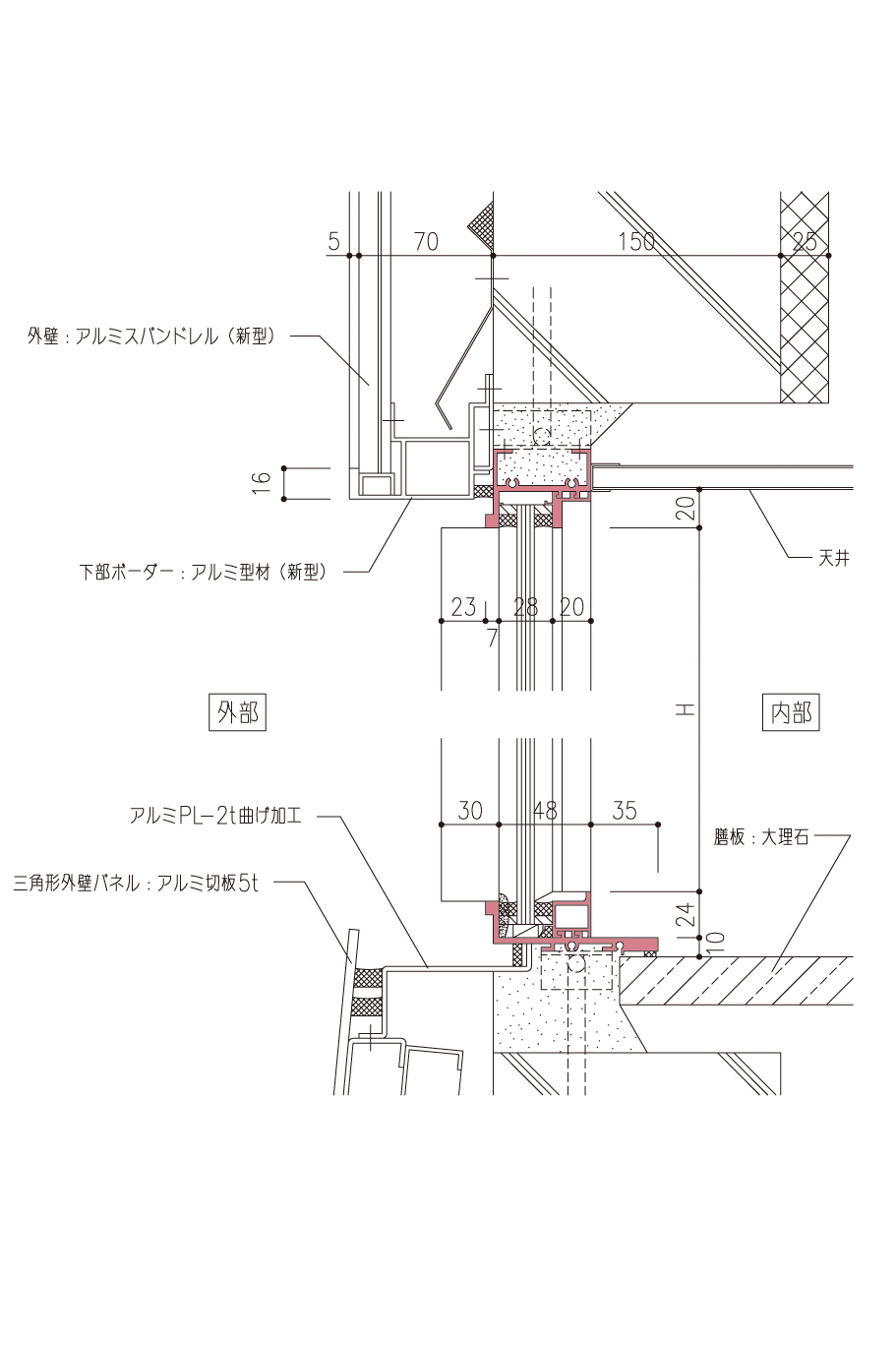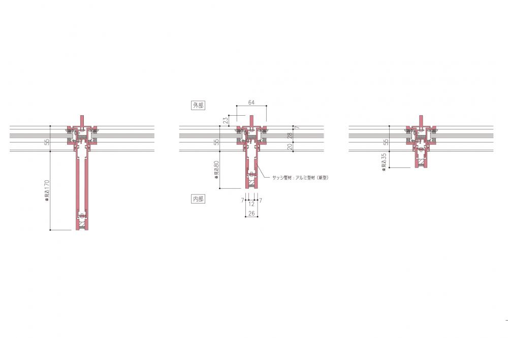 1980年代を通して日本もだんだん豊かになり、1992年に完成した第6期では新たに型を起こしてアルミを押し出しています。用いたのは方立で、見込み寸法の異なる3種類を用意しました。サッシの高さは低いところで1.1m、高いところでは5.6mにもなりますので、それぞれ耐風圧が異なることが原因です。