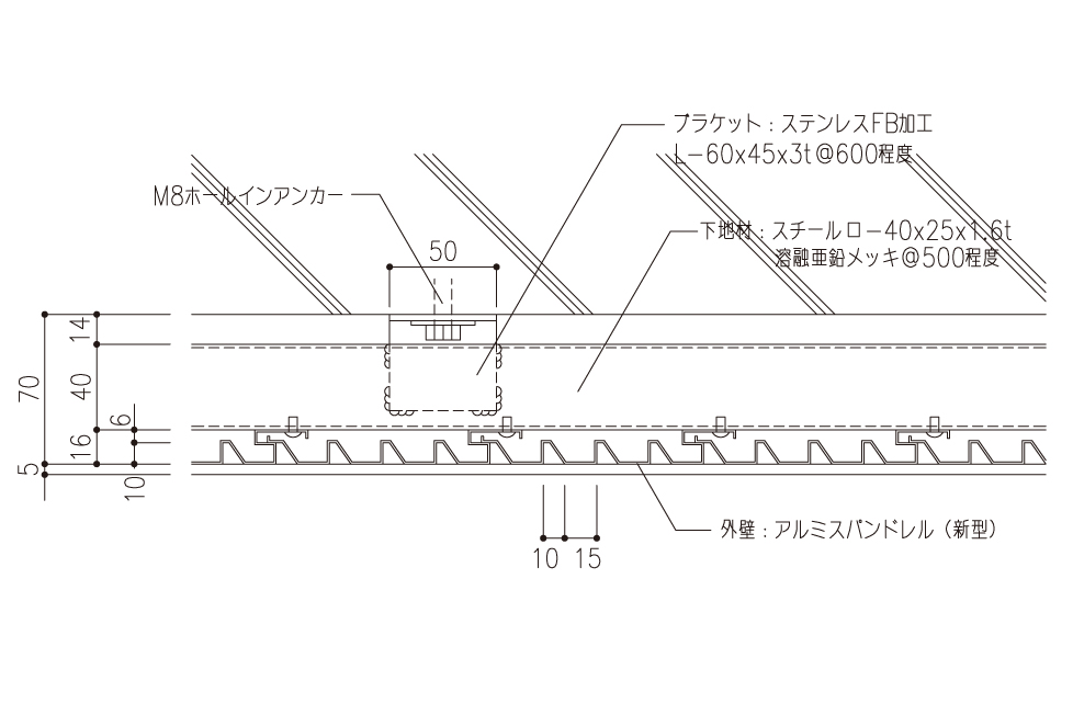 ガラス以外の部分にはアルミのコルゲート板を使いました。このコルゲート板、横方向ではきれいに連続するのですが、縦方向は難しく、通常は透かし目地にします。しかし、そうすると黒い線が強く出てしまいますので、目地部分に裏から別のコルゲート板をあてがっています。下のコルゲート板のみに溶接されていますので、上のパネルとはスリープジョイントになっており、動きます。両方ともフッ素樹脂焼き付け塗装ですので、ジョイントラインが視覚的にソフトになりました。
