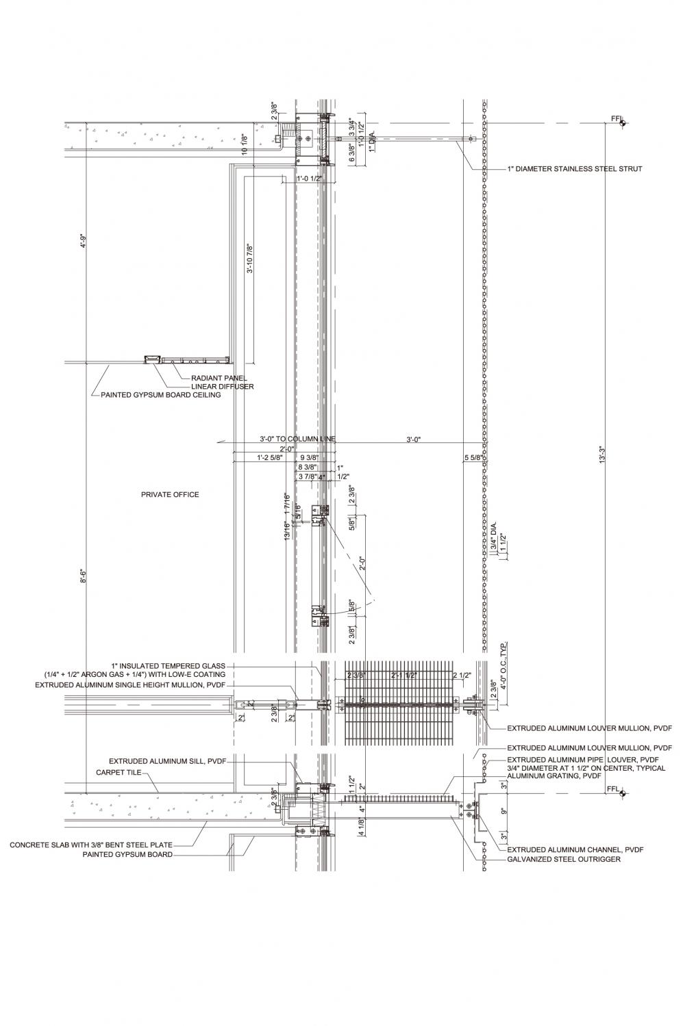 クライアントからは時代の先端を行くような透明な建物、かつ家のような施設をつくってほしいという要望がありました。しかし、透明といっても、ケンブリッジには建築の消費エネルギーに関する法規がありますので、総ガラス張りというわけにはいきません。そこでアルミスクリーンを使うことによって、熱負荷の問題を解決しようとしたのです。ヒルサイドウエストでも使って効果があることはわかっていましたが、規模がまったく違うということもあり、ディメンジョンは再検討しています。具体的にはヒルサイドウエストで15ミリだったパイプの直径と間隔を、M I T ではそれぞれ20ミリにしました。