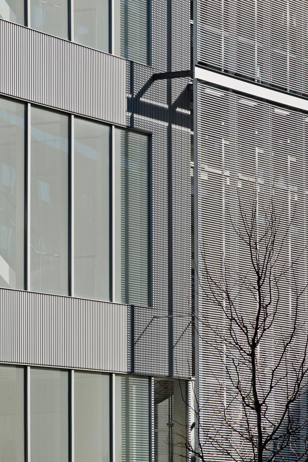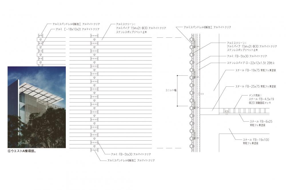 当初は、型材をR状にカットしてそこにビス留めすることを考えていたのですが、現場からの提案で溶接になっています。片側だけ、しかも上の方だけを溶接することで、アルミの溶接につきもののゆがみの問題を解決しています。ちなみにヒルサイドウエストはアルマイトのみですが、MITのアルミスクリーンにはフッ素樹脂焼き付け塗装を施しています。2層ごとにユニット化して取り付けました。