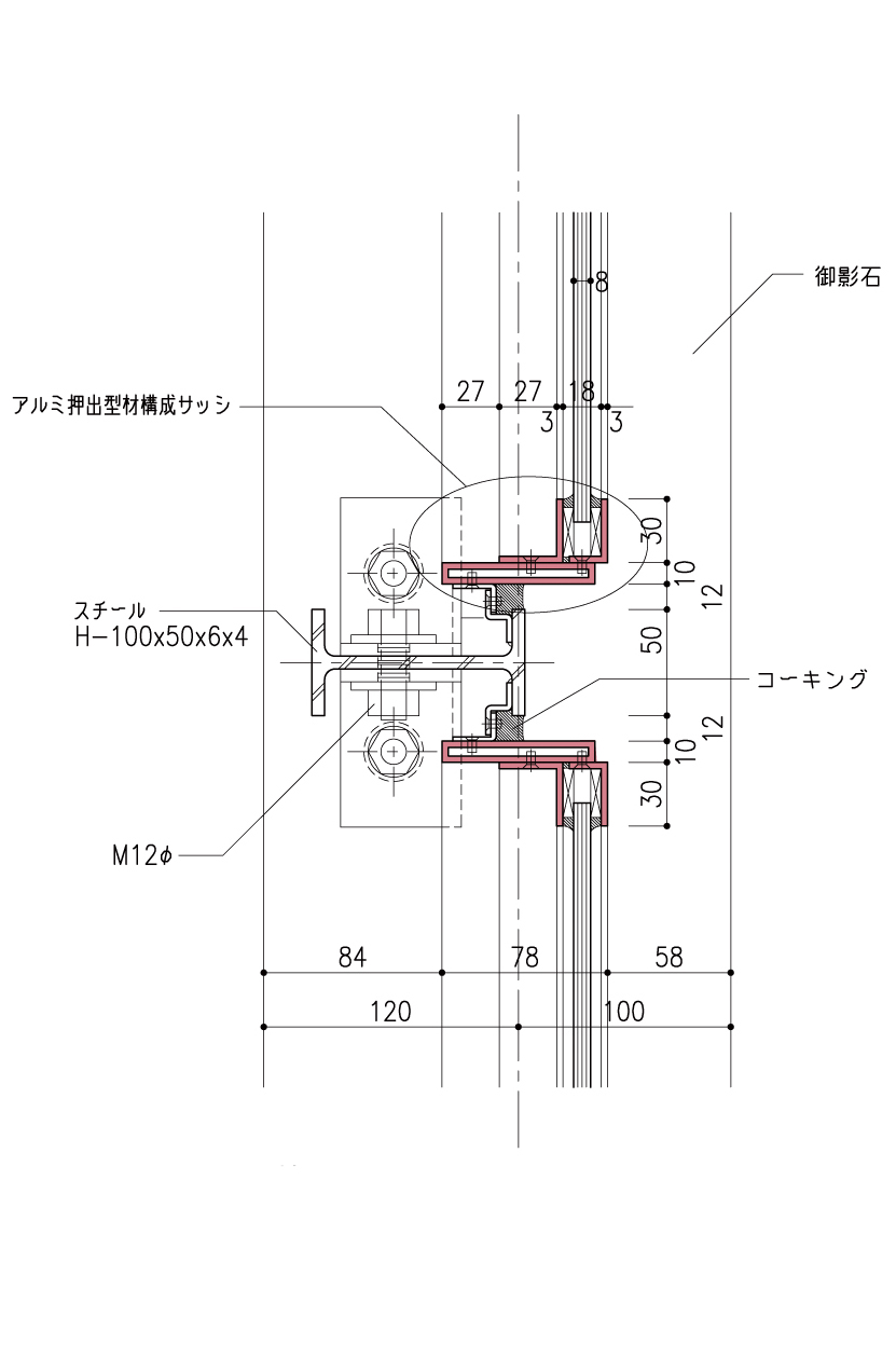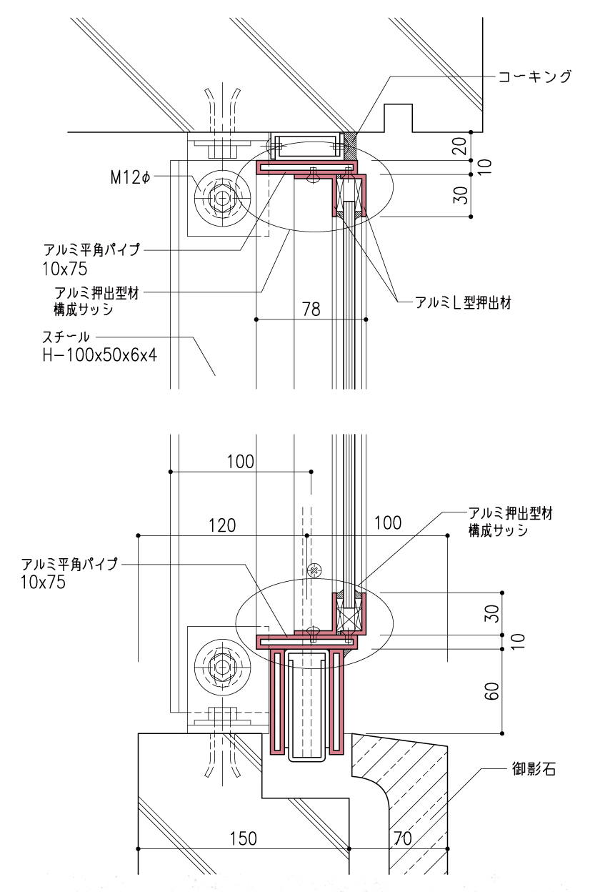 スチールのフラットバーを使えば見込み寸法も小さくて済んだのですが、アルミメーカーが単一材料での工事を希望したため、このような仕様になりました。