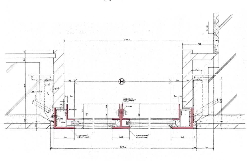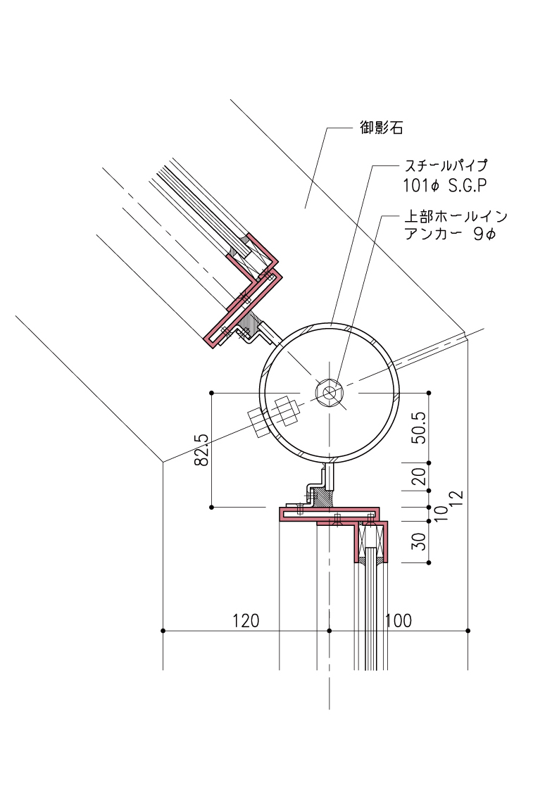 1950年代までアルミは少し贅沢な素材で、サッシといえばもっぱらスチールでした。しかし、60年代になると既成のアルミサッシの値段が手頃になってきます。しかし、ここは単なる開口部ではなく、自由に角度を変えながら内と外を仕切るガラススクリーンですので既成のサッシは使えません。かといって、わざわざ新規に型を起こすほど予算的に余裕がなく、手づくりとなりました。精度を要するガラス止めにはアルミアングル材、アルミ角パイプを用い、真っ直ぐな部分の継ぎ手支柱にはH型鋼、角度をもつ部分の支柱にはスチールの丸パイプを用いました。私たちにとって思い出に残るディテールです。現在もそのままの形で使われています。