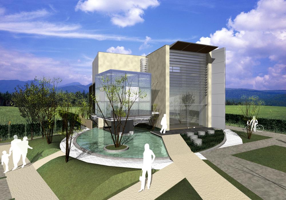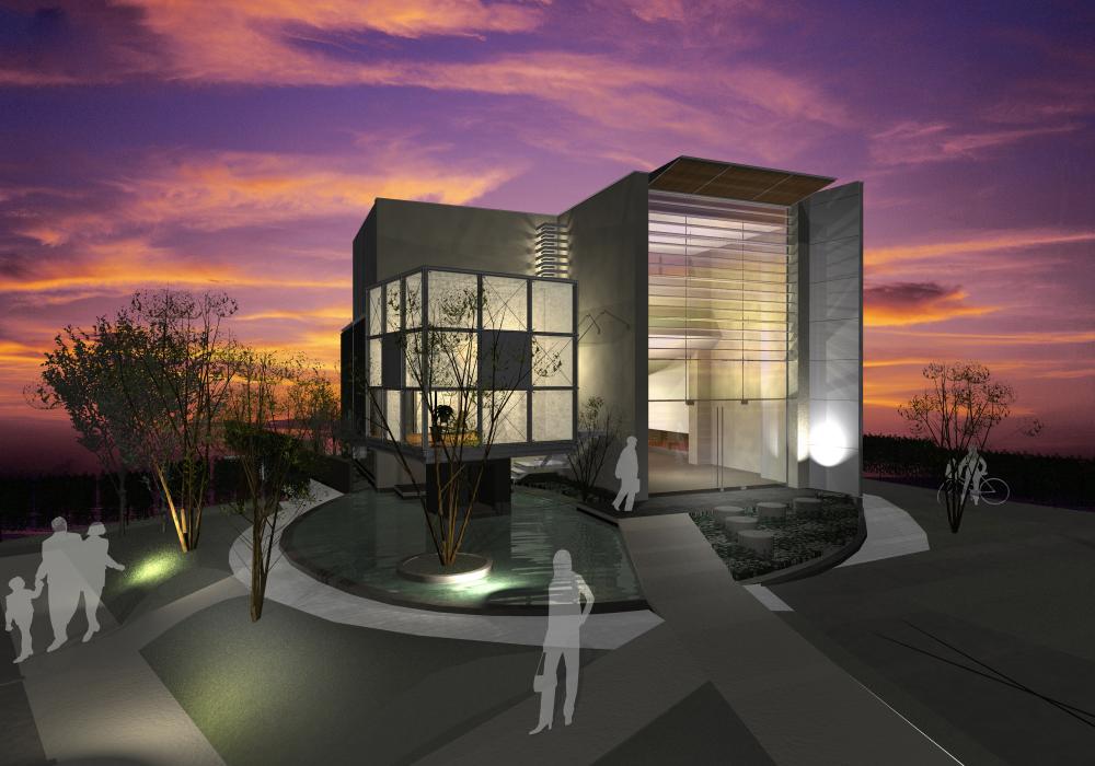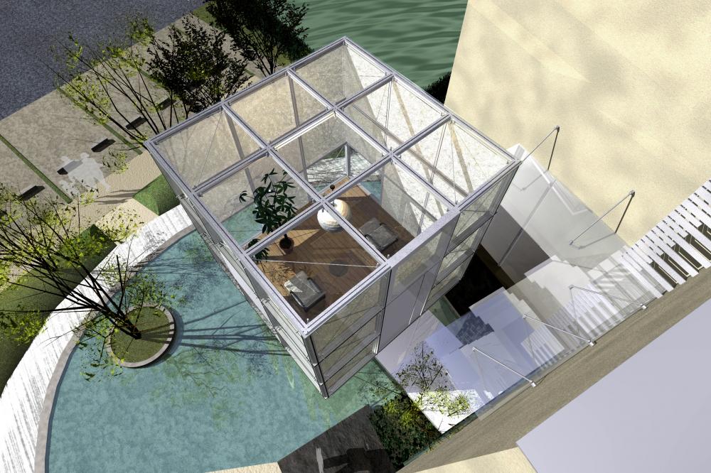 戸谷さんはこのtsubomiを見て、漠然とした構想が一気に具体的なイメージへとまとまっていくのを感じました。というのも戸谷さんは、このARRTY@ARRTY那珂川店で、美容室とは別にリラクゼーションルームをつくりたいと考えていたからです。美容とは容姿を美しくすること、そのためには型を整えるだけではなく、心身ともにリラックスしてもらうことが必要であると考えた戸谷さんは、マッサージなどを行う非日常的な空間をtsubomiで提案することにしたのです。クライアントもこの提案には大賛成。外観デザインの鍵ともなるtsubomiは、このような経緯で実現に向け動き出します。ここでは用途を考え、1m角ではなく、1.2m角のパネルを使用。遮光フィルムを貼った3.6m四方のガラスキューブが出来上がりました。また、地面に置くのではなく、池の中央部にコンクリート打放しの支柱を立て、その上にtsubmiを設置することで、浮遊感を際出させるほか、キューブのコーナー部のエッジをシャープに見せることにも気を配りディテールをつめていきました。このシャープさは、12年後の今もまったく変わっていません。池は管理に手間がかかることから水が抜かれ、水面から立ち上がる感じはなくなってしまいましたが、浮遊感はむしろ増したのではないかと思います。竣工時と比べすっかり生い茂った植栽の中にガラスキューブが浮かんだ様がとても印象的でした。