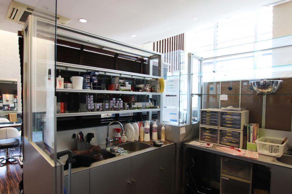 美容室の内部は、清掃が行き届いているせいもあって、外観以上に美しさを保っています。設計時に意識された耐薬品性(耐食性)といった点においても、ここでアルミを採用いただいたことは間違っていなかったと確信できました。見る限り薬品による汚れや劣化などはまったく見て取れません。今回の訪問に同行していただいた設計者の戸谷さんもこのことに対しては大変驚かれていました。戸谷さんは見学を終えて次のように語ってくださいました。「アルミを使った内部の造作は、従来の木製の家具に比べ取り扱いが難しく、事前の設計段階での施工図のやりとりが通常の場合に比べて数倍かかります。そのため、イニシャルコストも当然かなりかかりますが、いったんつくってしまえば通常の改装サイクルの3倍は長く使えて、しかも、改装なり移転する際も、大部分の材料が設計の工夫次第では転用が可能。こんな素晴らしい素材は他にはあまり見当たらないと思います」。アルミ好きな戸谷さんをさらにアルミ好きにさせたARRTY@ARRTY那珂川店。アルミ建築の記念碑的な作品であることを改めて確信しました。