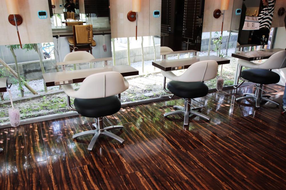 今回、改めてARRTY@ARRTYを拝見させていただき、12年の歳月が流れたとは思えないほど、鮮烈な印象を放っていることに驚かされました。これは、設計者である戸谷さんの手腕、とくに「対比」を意識してデザインされたことが功を奏しているためです。母屋のコンクリートと離れのガラスとの対比、コンクリートとガラスといった工業材料と前庭の植栽との対比が、見る人にその存在を訴えかけてくるのだと思います。この対比の手法が使われているのは外観だけではありません。tsubomiのリラクゼーションルームの内装には、佐賀県の重要無形文化材である肥前名尾和紙が用いられています。ここでは、アルミ、ガラスといった素材と和紙の対比が、鮮烈な印象というよりも安心感を生み出していると感じました。母屋である美容室の内装にも、アルミだけではなく木をはじめとした自然素材が意識的に使われています。実際はSUSのアルミ製品のオンパレード、さながらショールームなのですが、金属の圧迫感がまったくありません。スタッフの方も、ことさらアルミを意識せずに使っていらっしゃるようでしたが、その理由はこのあたりにありそうです。ちなみに、アルミがこれだけ使われていることに不満はありますかとスタッフの方にお尋ねしたところ、マグネットを使った張り紙ができないので、それが困りますとだけ話してくださいました。